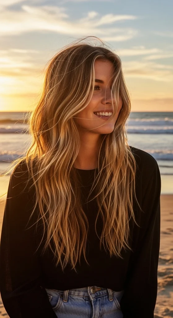 Beachy layers are achieved by cutting at various angles to create texture and remove weight in strategic places. This style works particularly well with highlights or balayage, as the layers help showcase color dimension beautifully. Styling is minimal – just some texturizing spray and you’re ready to go.