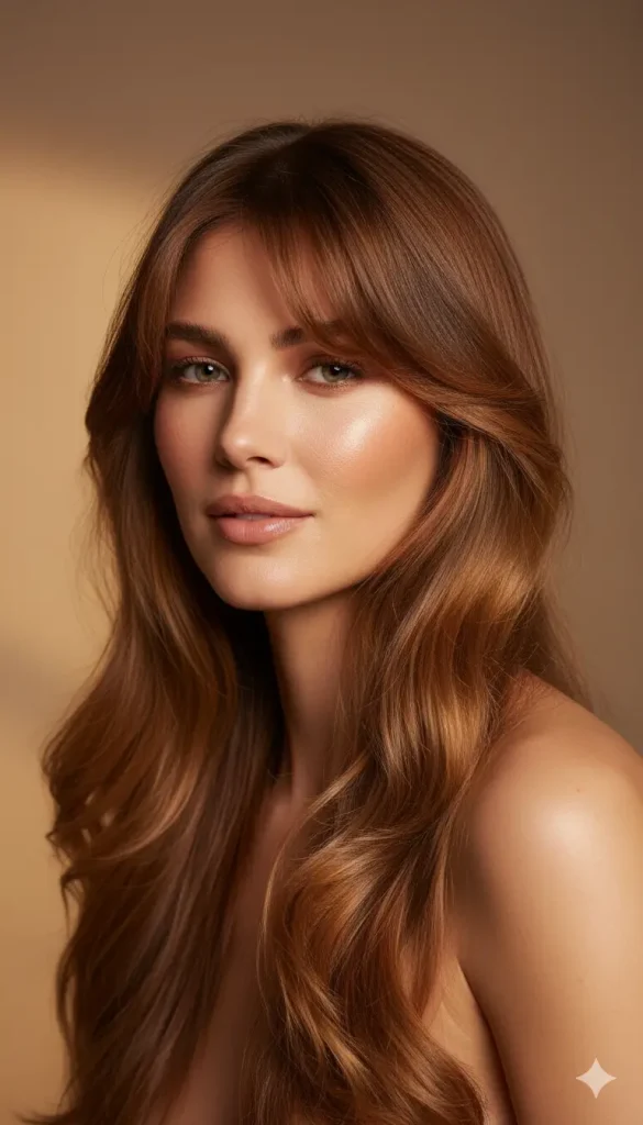 Curtain bangs paired with long layers create the most romantic, vintage-inspired look that’s currently dominating social media and Pinterest boards everywhere. The soft, parted bangs frame your face like curtains while the long layers add movement and dimension throughout.