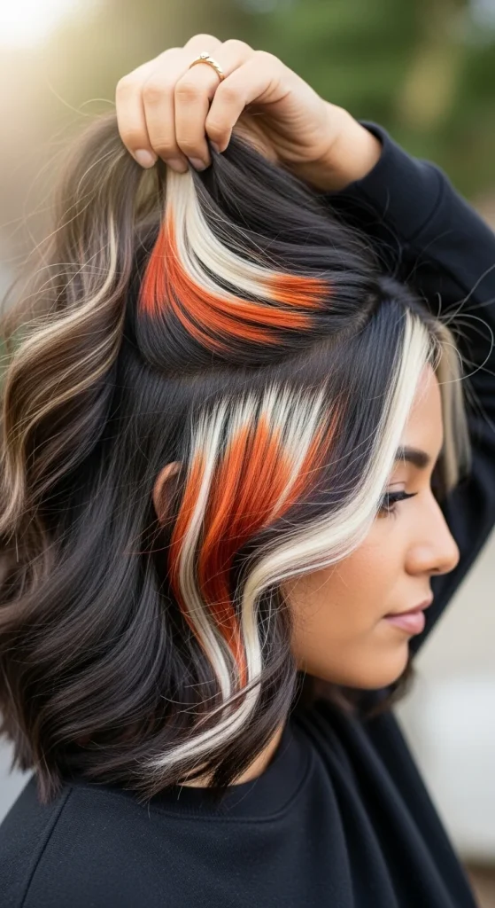 This innovative coloring method draws inspiration from calico cats, known for their beautiful patches of orange, black, cream, and white fur. When applied to hair, this technique translates into strategically placed color sections hidden beneath your natural or base-colored top layer. The result is a multi-dimensional look that changes appearance based on how you style your hair.