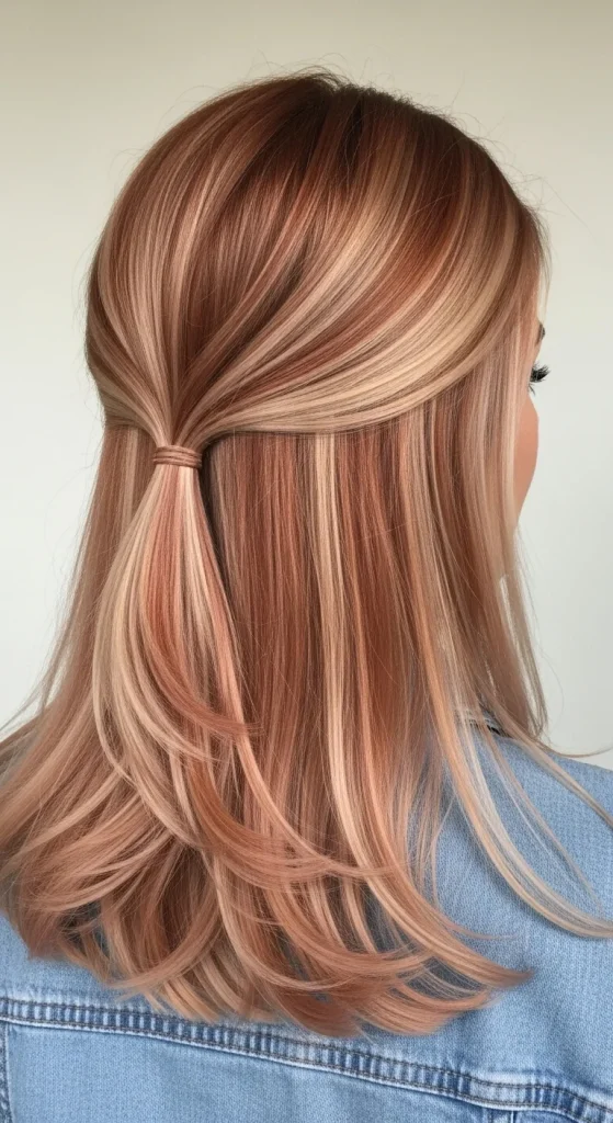 Rose gold continues to dominate hair trends, and incorporating it as a hidden color creates an elegant, sophisticated look. This combination pairs soft rose gold with copper and champagne blonde sections. The result is a luxurious, feminine aesthetic that adds warmth and dimension.