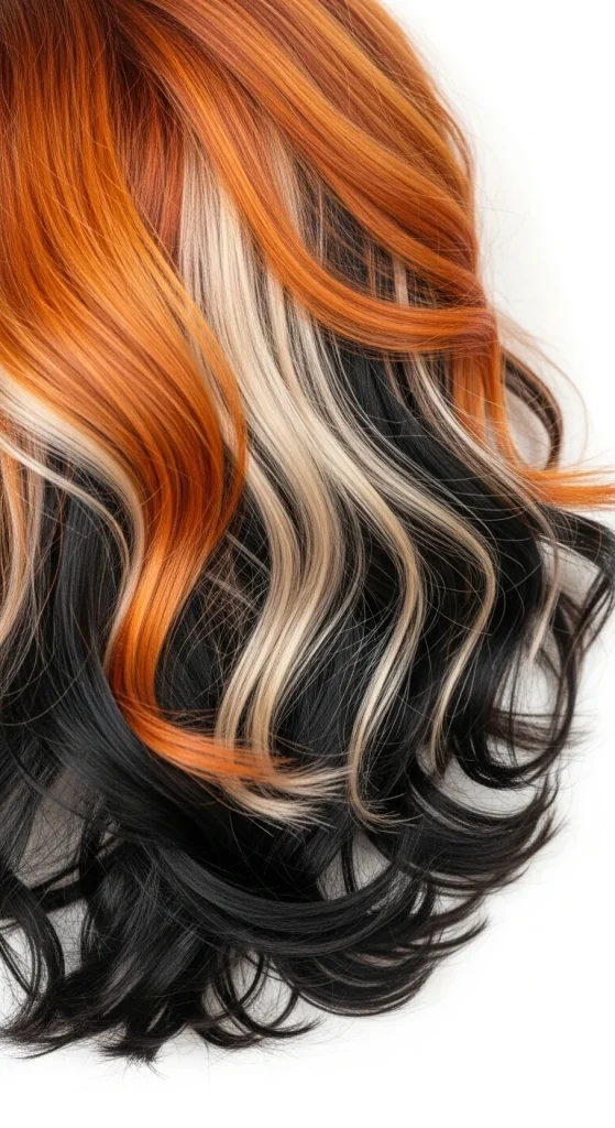 This combination stays true to the original calico cat inspiration. It features warm orange, creamy blonde, and deep black sections placed strategically underneath a brown or dark blonde base. The warm tones catch light beautifully and create a cozy, autumn-inspired aesthetic that works year-round.