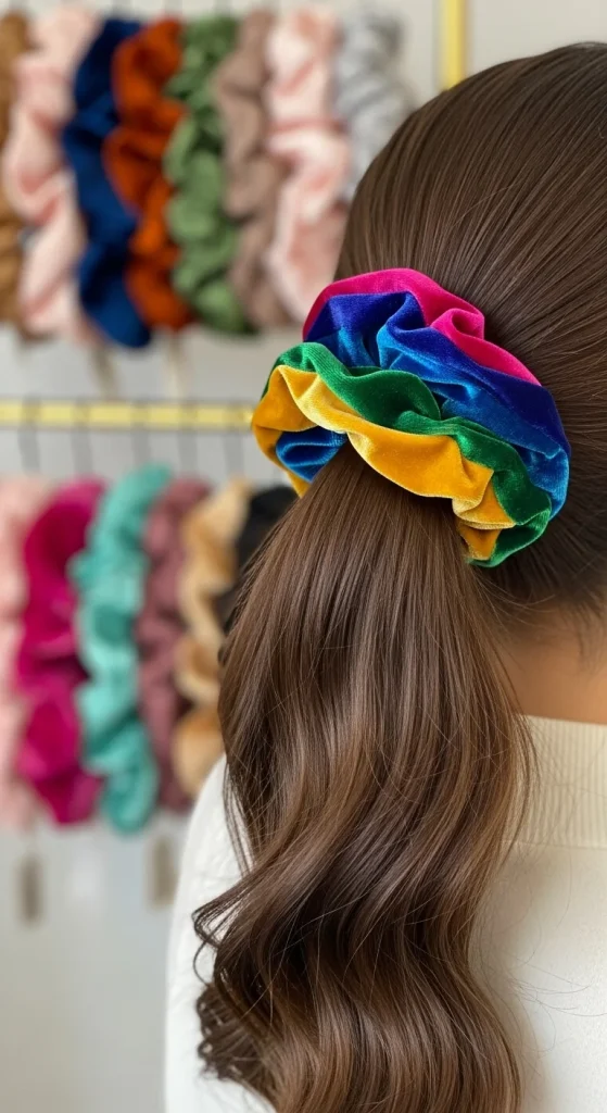 Scrunchies have returned as both functional tools and fashion accessories. Create any ponytail style and secure it with a colorful scrunchie that complements your outfit. The fabric-covered elastic adds instant visual interest.
