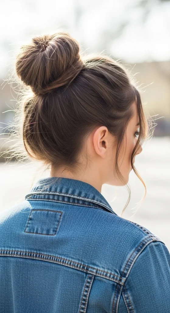 Gently pull at sections of the bun to create volume and texture. A few face-framing pieces left loose add a soft, romantic touch. This is one of the most popular easy hair ideas for school because it genuinely takes no time and always looks adorable.