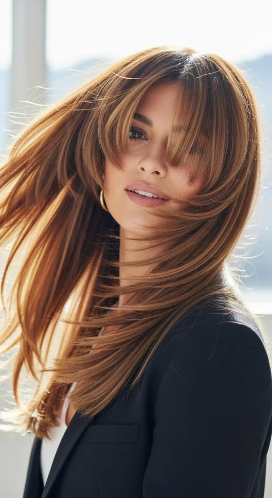 Curtain bangs continue to trend for good reason. They frame the face beautifully and blend seamlessly into longer layers. The center-parted style creates a vintage yet modern appeal.