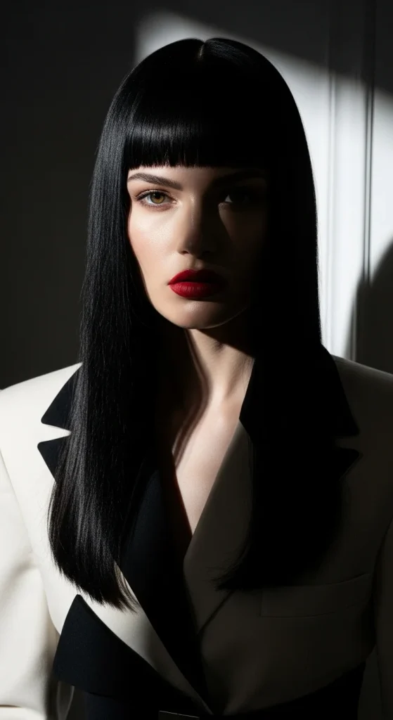 Blunt bangs create a powerful, iconic look when paired with straight hair. These thick, full bangs cut straight across make a bold statement. This classic combination has been favored by style icons for decades.