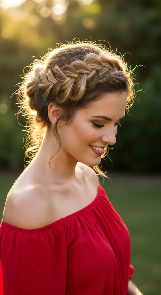This regal style wraps around your head like a crown, making you feel like royalty on your special evening. The braided crown updo offers both security and stunning visual impact.