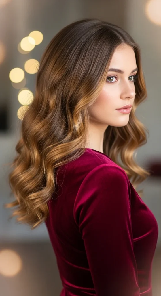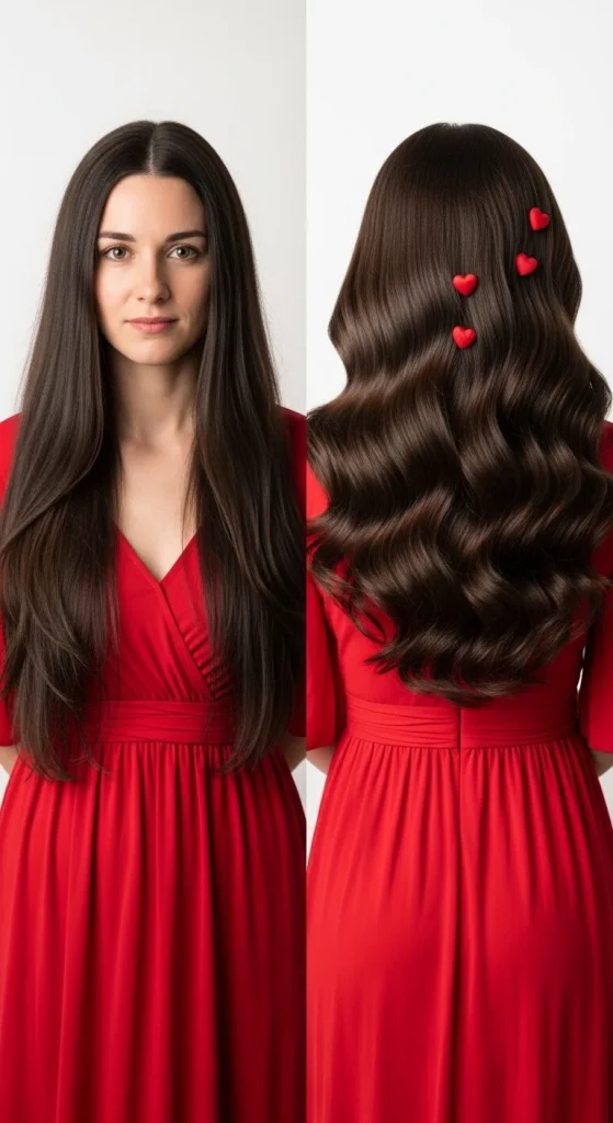 This timeless style works beautifully for any Valentine’s Day occasion. Loose waves frame your face softly and create movement that catches light perfectly in candlelit settings.