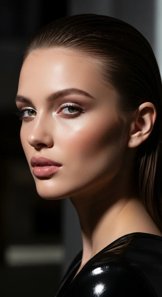 The slicked-back hairstyle exudes sophistication and confidence. This powerful look has been embraced by celebrities like Zendaya and Bella Hadid for high-fashion events and editorial shoots. The style pulls hair away from the face, highlighting bone structure and facial features.