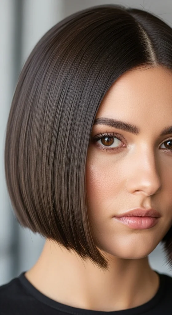 To achieve this style, you need perfectly healthy hair and a good flat iron. The key lies in using a high-quality heat protectant followed by a smoothing serum. The cut typically falls between chin and shoulder length, with blunt ends that enhance the sleek appearance.